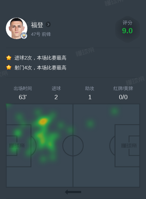 福登不仅在进攻端表现出色,他在场上的综合能力也值得称赞。尤其是他的传球技术,全场比赛他总共传出27脚球,其中24次传球精准,传球成功率高达89%。福登的传球为曼城的进攻提供了有力支持,帮助球队在中场控制局面。